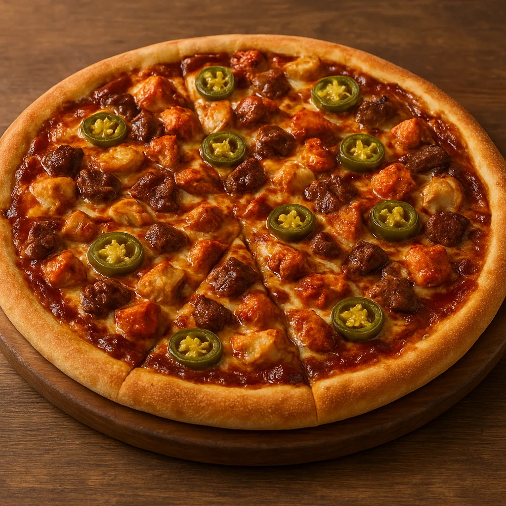 A delicious BBQ Classic pizza topped with juicy plain chicken, fresh mushrooms, and black olives on a rich BBQ sauce base.
